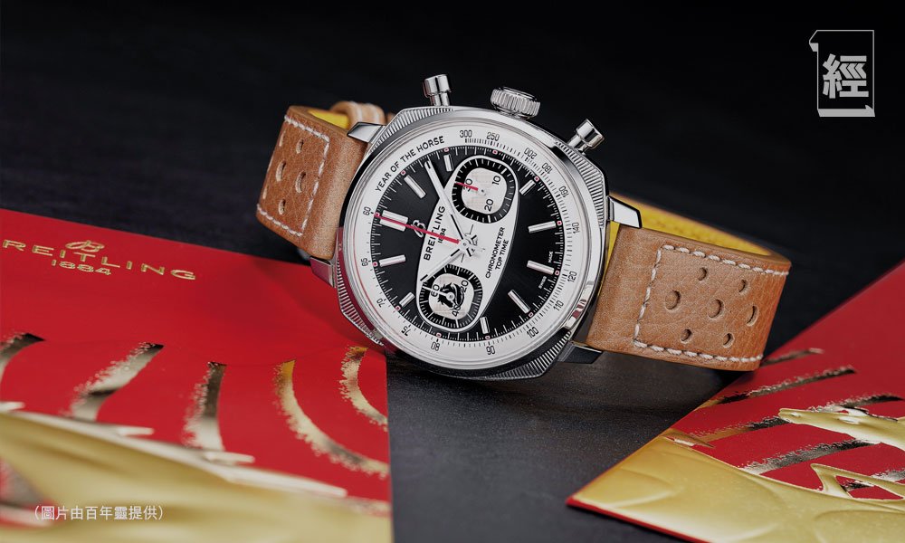 經典黑白配色表盤,中央是致敬歷史的長方橢圓形「儀表盤」設計,搭配兩個方圓形計時小表盤,9時位小秒盤飾有點題的黑騎頭部側影,測速刻度圈飾有「YEAR OF THE HORSE」字樣。