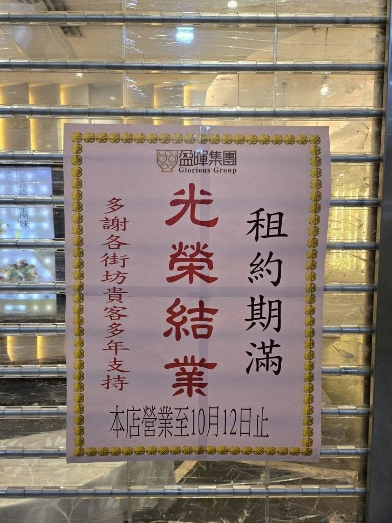 香港飲食業結業潮持續延燒,中式酒樓首當其衝。位於海怡半島西商場的「盈暉海鮮酒家」於10月12日結束營業,大門貼出「光榮結業」公告,標誌該品牌在香港全線分店關門大吉。這是繼長沙灣分店8月結業後的第二擊,高峰期曾擁有8間香港及澳門分店的盈暉集團,如今僅剩澳門威尼斯人一店。盈暉長沙灣分店早前結業後,曾爆出拖欠逾50名員工薪金、補償等,總額約700萬元。
