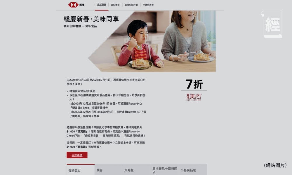 另外,用滙豐信用卡在美心購買賀年糕點也可獲七折優惠,舉例原價173元的椰汁年糕,折後價121.1元。留意優惠期至2月11日。
