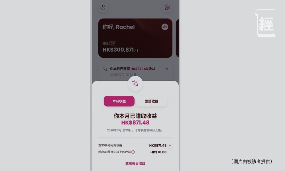 用戶存入的首10萬元,可享年回報3.8厘;其後的20萬元,可享年回報3.5厘;假設存入30萬元,每天約可以獲得29元。