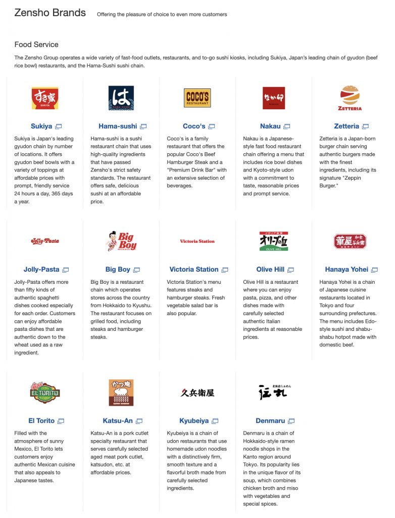 在小川的領導下,Zensho 並非只經營 SUKIYA 一個品牌,而是透過積極併購逐步砌成橫跨多個品類的餐飲王國。 集團旗下包括家庭餐廳 Coco’s、丼飯及烏冬品牌 Nakau、迴轉壽司連鎖濱壽司(Hama Sushi),亦於 2023 年收購漢堡連鎖 Lotteria,進軍快餐市場。