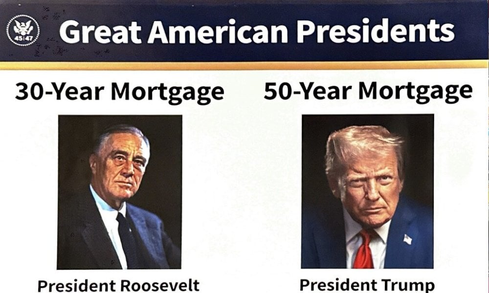 特朗普於社交平台Truth Social上載一張頗具象徵意味的圖片:左邊是前總統羅斯福(Franklin D. Roosevelt)的肖像,下方標註「30年期房貸」;右邊則是他自己的肖像,標註「50年期房貸」,並配上「偉大美國總統」的字樣。外界普遍認為,他此舉意在將自己與當年推行「新政」的羅斯福並列,試圖塑造「再造美國中產」的形象。