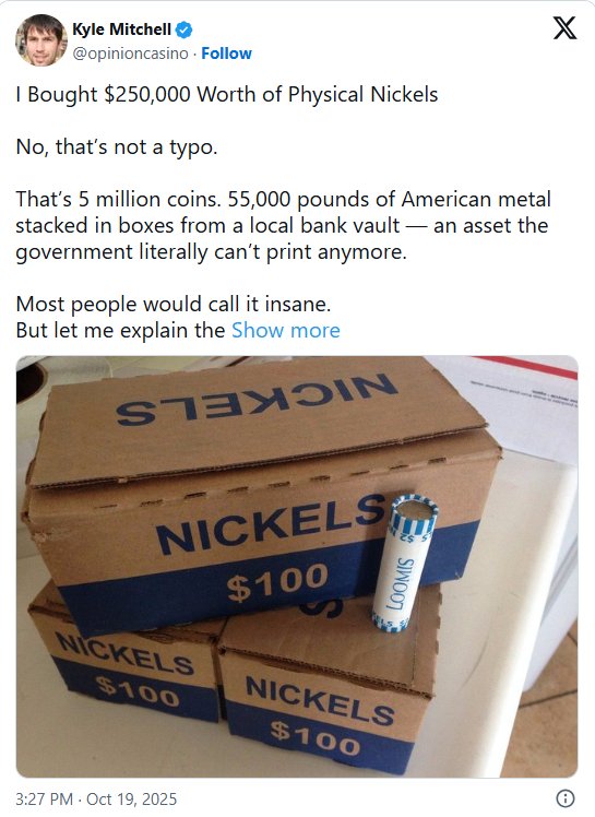 除了鎳幣,Mitchell 早前也曾收集約 2 萬磅、1982 年前製造的高含銅量一美分硬幣——當時的銅幣金屬價值同樣高於面額。他相信,法定貨幣長期被政策扭曲,只有回歸實體金屬才能保值。