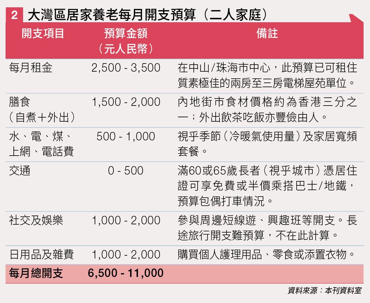對於剛退休,身體仍壯健的「初老」族,可考慮選擇在中山、珠海或惠州等二線城市租樓,生活成本低於深圳。一個二人家庭的預算,每月開支由6,500元至11,000元人民幣不等(圖表二),除開即每人大約是3,250元至5,500元人民幣。