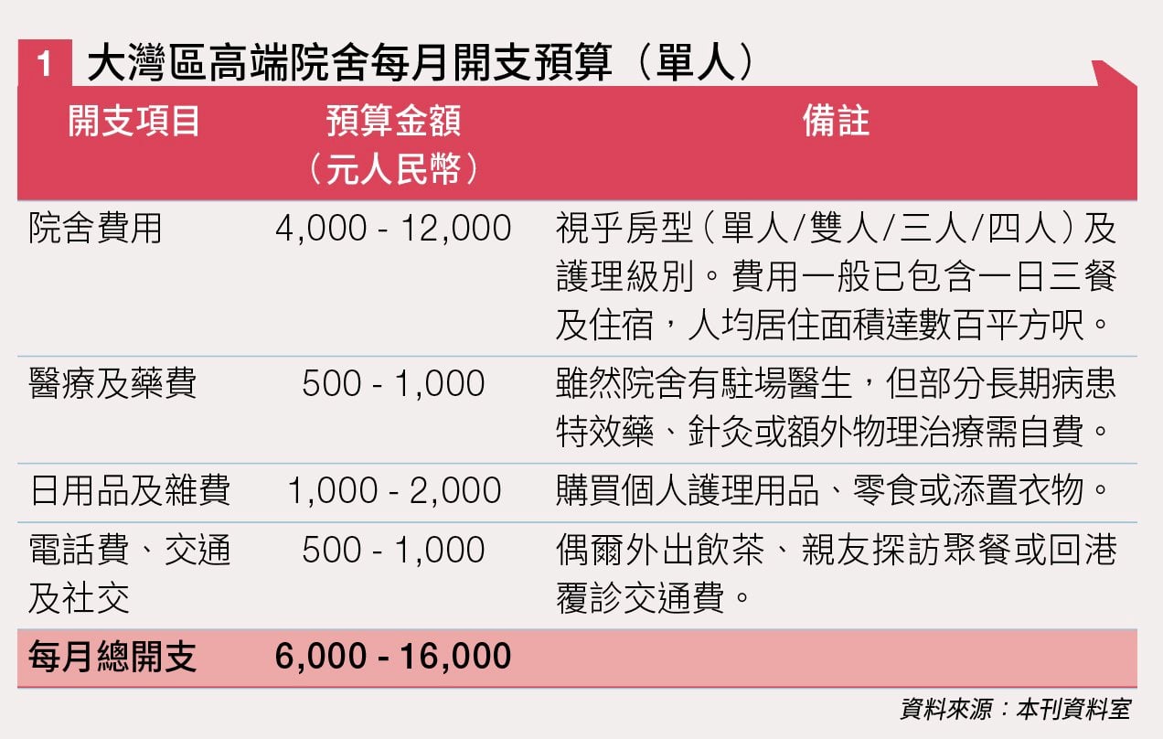 對於需要護理服務或不想操心家務的長者,可考慮入住高端院舍。根據採訪的深圳頤康院網上收費資料,整理了所需支出(圖表一)。