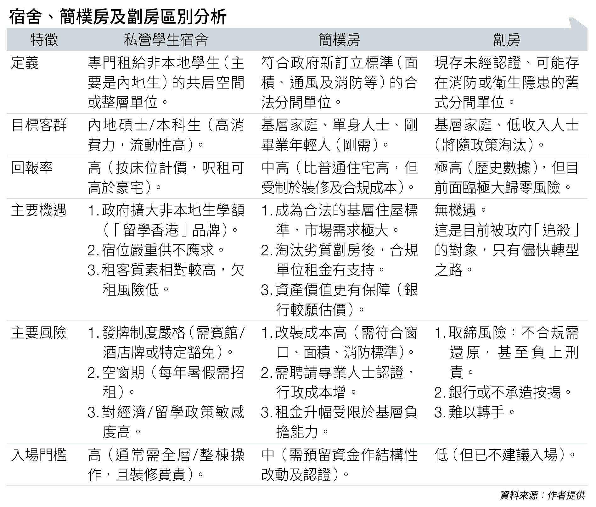 為了易於理解,筆者將友人「偉論」整合,用圖表列出宿舍、簡樸房及劏房這三者之區別、風險與機遇(見圖表)。