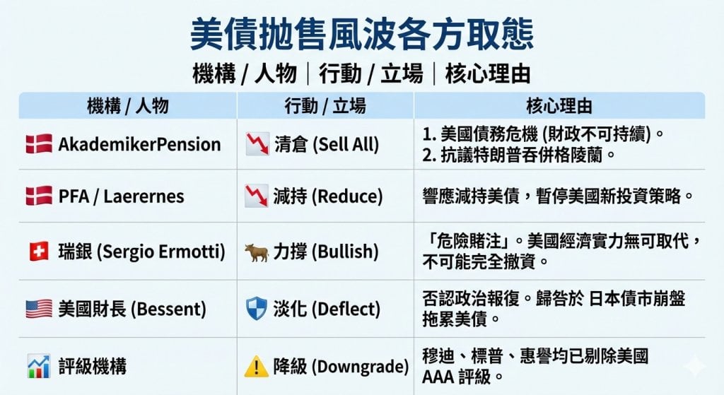 | AkademikerPension | 📉 清倉 (Sell All) | 1. 美國債務危機 (財政不可持續)。 2. 抗議特朗普吞併格陵蘭。 |