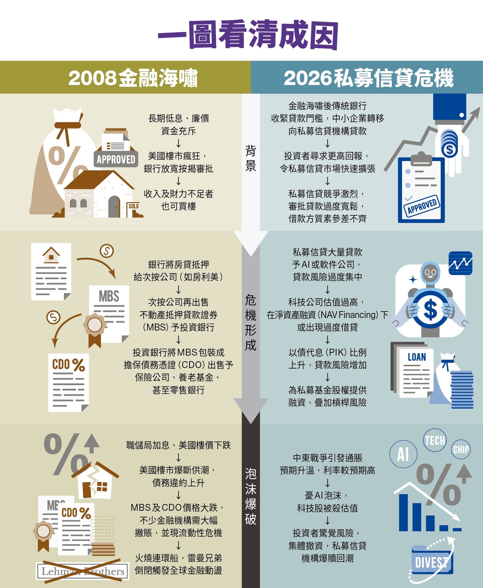 單從數據上看,私募信貸市場規模確實不比次按小。熟悉環球局勢的財經專欄作家鍾俊鏗指出,當前私募信貸市場的規模估計達17,000億至35,000億美元之間(視乎統計口徑),明顯超越2008年次按約12,000億至15,000億美元的規模。另一個相似之處,是次按與私募信貸都被包裝成高回報、低風險的產品。