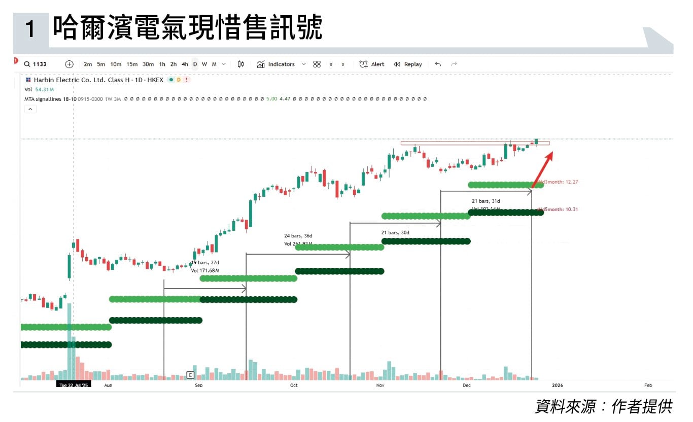 然而,市場給了筆者與讀者一個極強烈的訊號:哈爾濱電氣的股價,僅僅在12月16日進行了極其輕微的調整,便提前見底並扭頭向上,隨後更是悄然突破新高(見圖表一)。這正是筆者夢寐以求的形態。在預期的週期低點窗口,如果看到賣盤極其稀少,股價拒絕深跌,這充分說明籌碼已落入強手(Smart Money)中,主力「惜貨如命」。這種「調整不願跌」的表現,是後市將有強大爆發力的最直接證據。