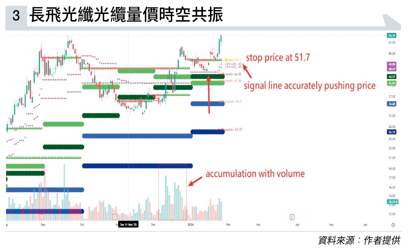 最後一個案例是筆者在1月27日精選的長飛光纖光纜。這是一個結合了週期、量能與信號線的完美案例。