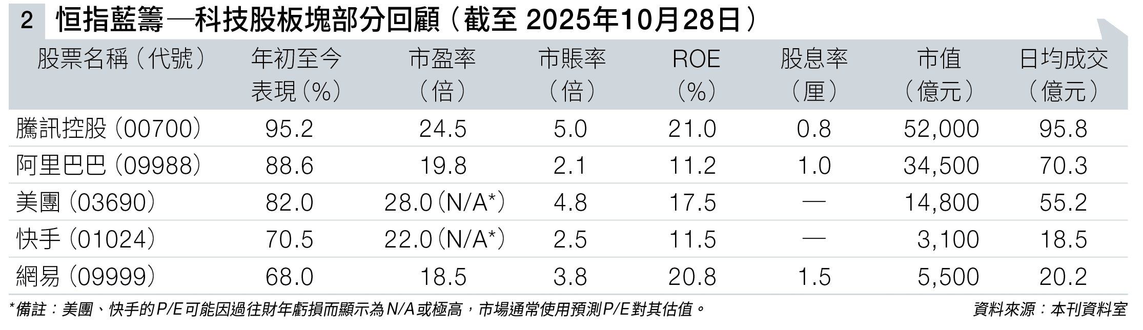首先,從藍籌升跌幅排行榜中,反映了今年的主題是「增長+流動性」,科技股王者歸來,2025年表現最好的前三位,分別是騰訊控股(00700)、阿里巴巴(09988)和美團(03690)。