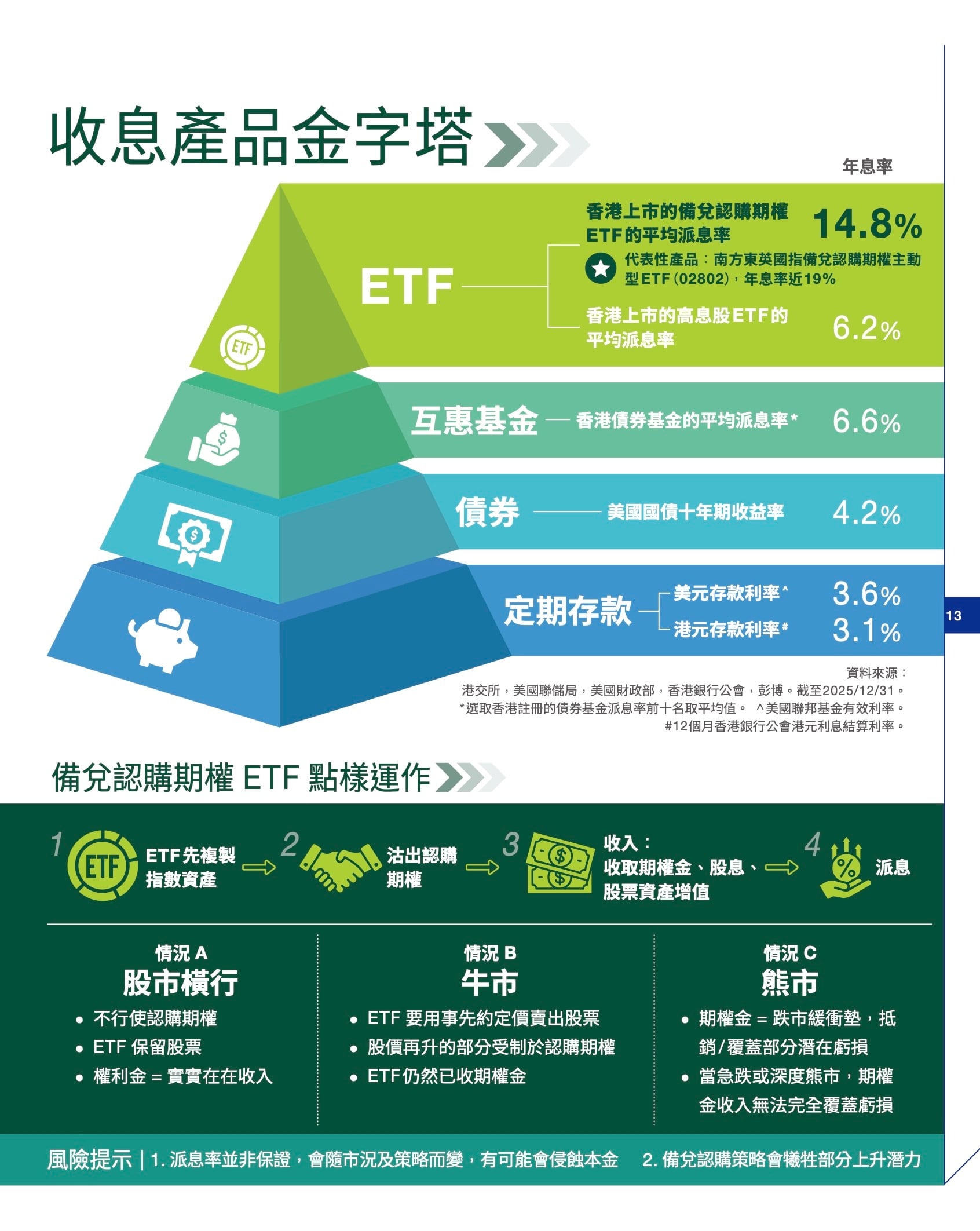 他提到,Covered Call ETF是香港近年推出的結構化ETF新產品,豐富了港股市場的產品選擇。以往這類投資策略只能在私人銀行或機構市場中找到,現在一般投資者也可買到。