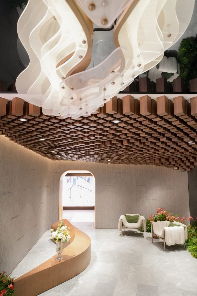 項目的建築美學由大堂開始延伸。樓高約8.8米的雙層住宅大堂以「Jewel Box」為設計概念,懸浮著以樹木年輪為靈感的藝術吊燈「沐之光影」,氣派非凡。