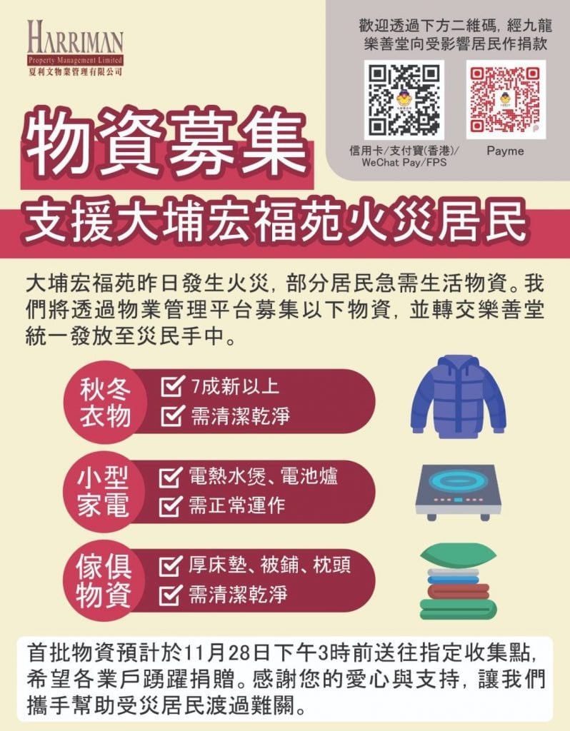 【支援大埔】會德豐旗下夏利文發起物資募捐 並全面檢視消防安全 經一編輯部 時事 Nov 28 2025 分享至 大埔會德豐火災 廣告 響應大埔宏福苑火災救援,會德豐地產旗下 Wheelock Living 透過夏利文物業管理有限公司(夏利文),於其管理屋苑設立捐贈站發起物資募集行動。所有收集到的物資將統一轉交九龍樂善堂,首批物資預計於 11 月 28 日下午送抵,確保第一時間發放至災民手中。 閱讀全文 除物資支援外,會德豐亦迅速啟動安全應對機制。集團即日安排團隊巡查旗下所有地盤及展覽廳,檢視防火措施是否合規。夏利文亦同步巡查管理物業的消防系統及走火通道,確保運作正常且暢通。 (圖片來源:會德豐) 針對涉及外牆維修工程的屋苑,會德豐已責成承建商嚴格檢視棚架及建築物料的安全性,以防範同類風險,全力保障住戶與公眾安全。 圖片來源:會德豐 分享至
