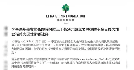 大埔宏福苑五級大火牽動全城人心。李嘉誠基金會今日(27日)宣布,李嘉誠先生對受災人士面對的重大損失深感難過,決定即時撥款3,000萬港元設立緊急援助基金,並承諾額外撥出5,000萬港元作後續支援,合共涉資8,000萬元。