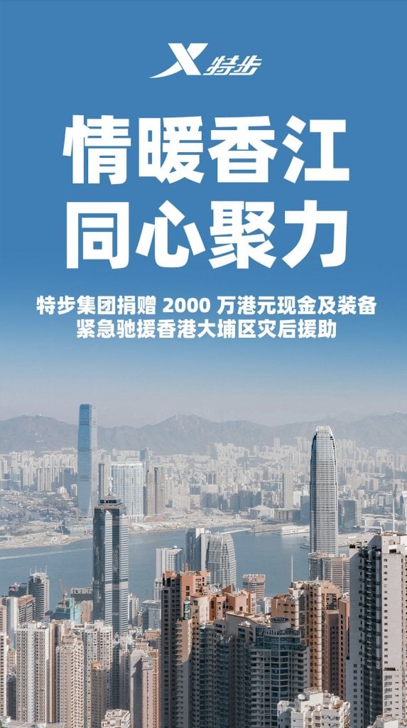 特步集團第一時間啟動緊急響應,捐贈2000萬港元現金及裝備,用於香港大埔受災同胞災後安置所需,爲同胞送去即時保障與溫暖。
