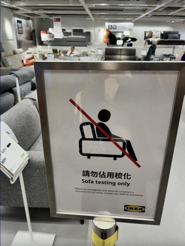 大型連鎖傢俬店 IKEA(宜家家居)一直以來深受港人歡迎,但其陳列區長期被市民當作「免費休息站」的問題亦困擾不少真正買家。近日有網民在 Threads 發帖,發現 IKEA 終於採取行動,在梳化陳列區擺放醒目的告示牌,明確寫上「請勿佔用梳化」及英文「Sofa testing only」(只供試用梳化),呼籲客人體諒,確保每人都有機會試用傢俬。