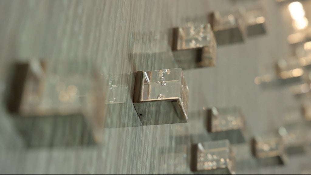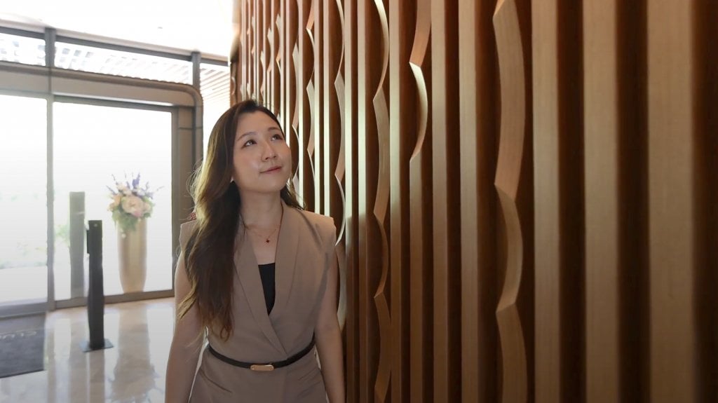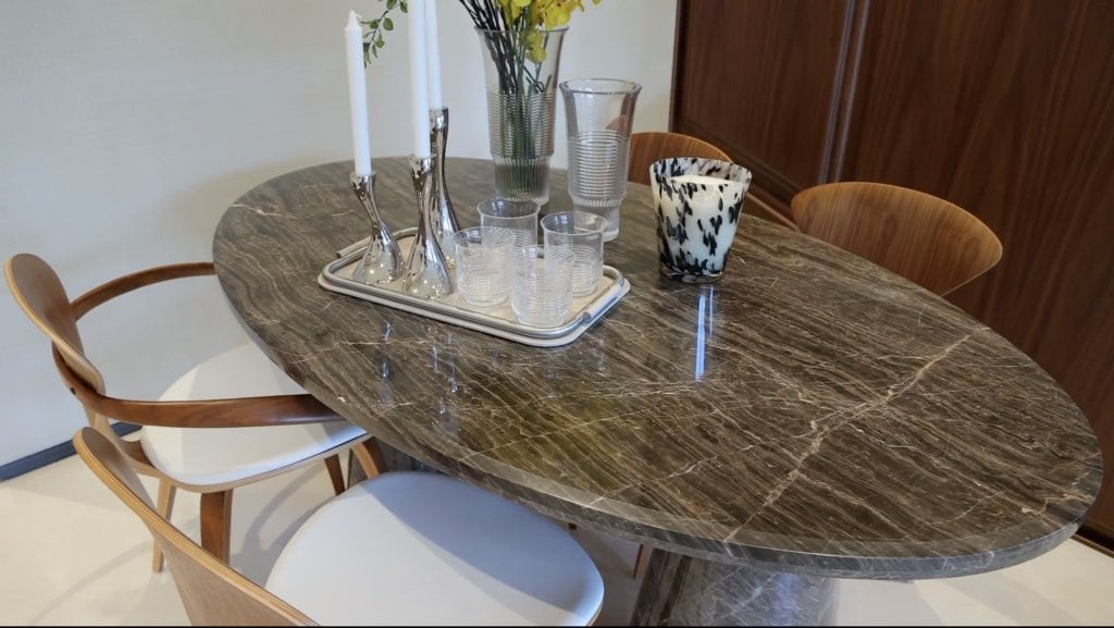 今次參觀的現樓示範單位位於2A座37樓,屬三房一套連工作套間設計,實用面積為853平方呎。單位由著名室內設計團隊 Philip Liao & Partners 匠心打造,以「Art Gallery」為設計主題,甫進門便能感受其獨特的藝術氛圍。客飯廳格局方正寬敞,空間感十足。地板及牆身鋪上天然石材,配搭木皮、金屬、鏡飾面與絨布等多種物料,質感豐富,營造出高雅的層次感。