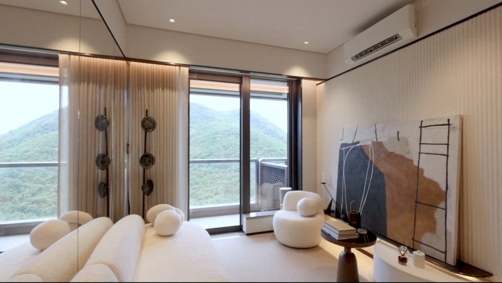 單位坐擁東南朝向的優勢,發展商特意為客飯廳配置大型落地玻璃,引入充沛的自然光線,讓室內明亮通透。設計師更巧妙地於客廳牆身裝上落地鏡飾,將窗外翠綠的南朗山景致反射入室,令室內空間與戶外景觀融為一體。客飯廳連接三合一露台與工作平台,住戶可以一邊品嚐咖啡,一邊細賞由香港仔海峽、南朗山一直延伸至深水灣與壽臣山的壯麗景致。更值得一提的是,單位內所有睡房與客廳均朝向同一方向,即使在房間休息,亦能飽覽這片珍貴的山海雙景。