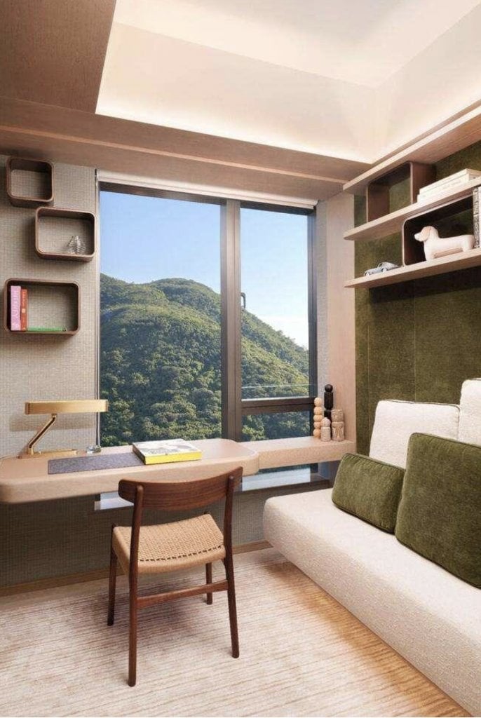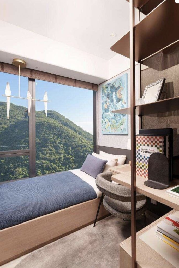 其餘兩間睡房的設計亦別具心思。其中一間被打造成書房,窗外一片綠意盎然的山景,猶如一幅靜謐的風景畫一樣 ,讓人在此閱讀或工作時,能享受一份難得的寧靜。另一間睡房同樣空間寬敞,可輕鬆容納睡床、衣櫃與書檯,功能齊備。