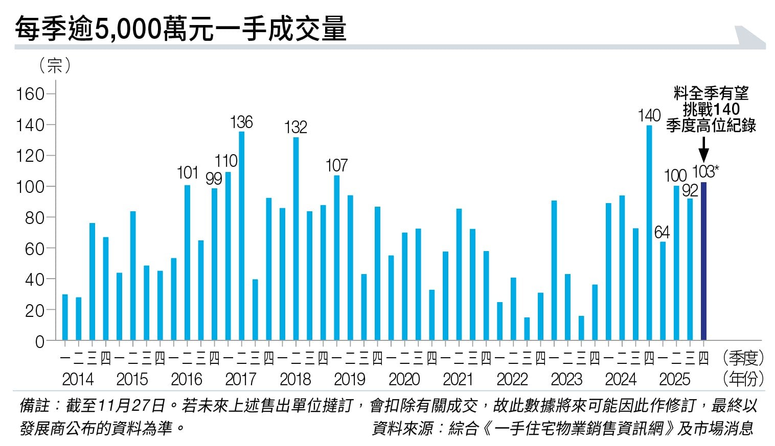 據美聯物業研究中心綜合《一手住宅物業銷售資訊網》資料及市場消息,第四季截至上週四(11月27日),累計錄得103宗逾5,000萬元一手豪宅買賣,創出近四季新高,預期今年第四季,最終有力挑戰去年第四季錄得約140宗的季度高位紀錄,凸顯豪宅市場強勁購買力。