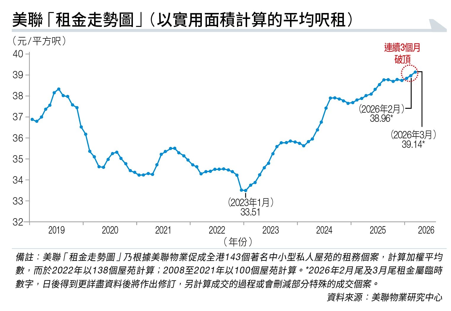 據美聯「租金走勢圖」3月以實用面積計算的私人住宅平均呎,租報約39.14元,按月上升約0.46%,幅度較2月升約0.36%擴大,並創七個月的單月最大升幅。隨著租金上揚,自今年1月突破歷史新高後,私宅呎租已連續三個月「月月破頂」。