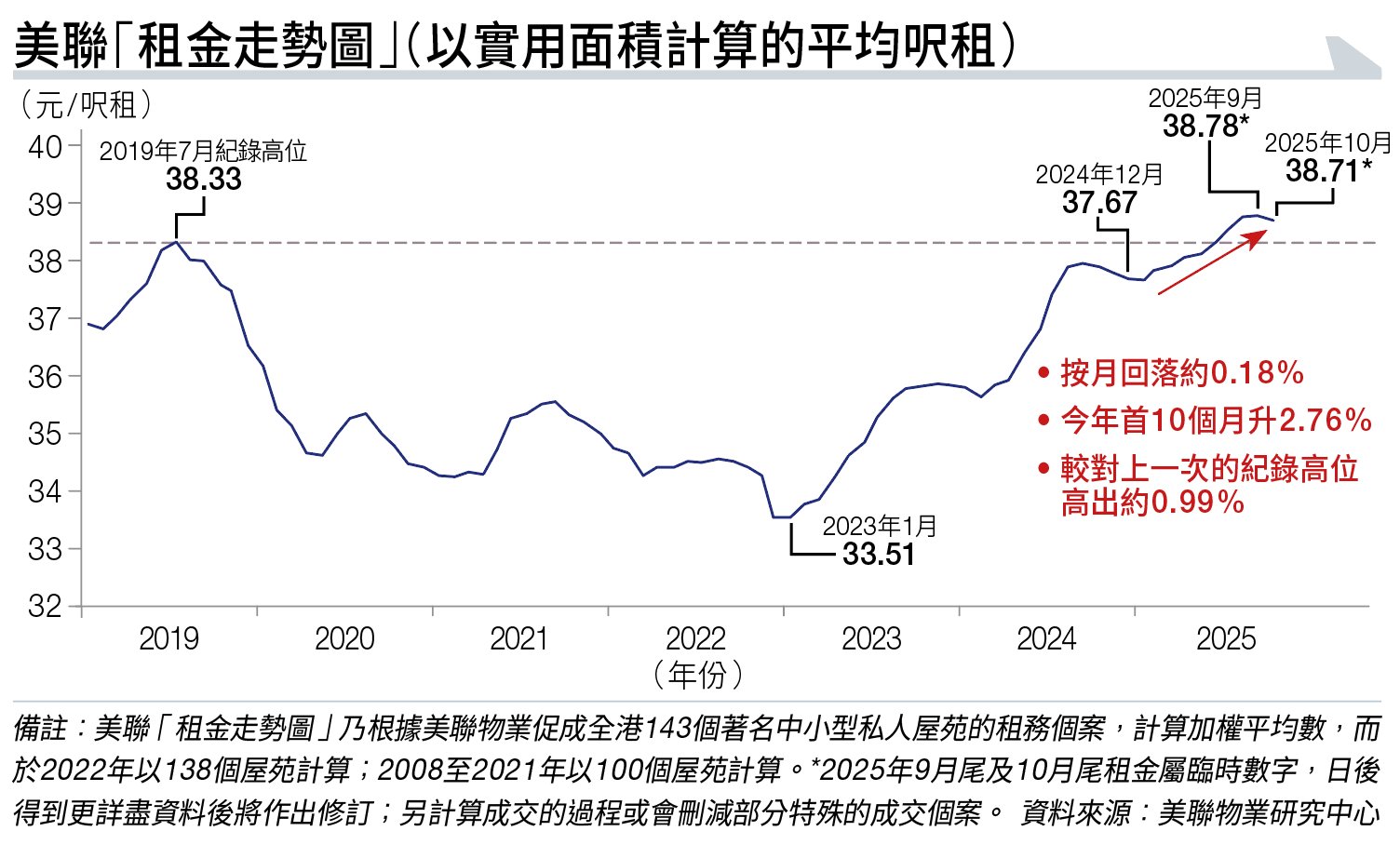 據美聯「租金走勢圖」10月以實用面積計算的私人住宅平均呎租報約38.71元,按月僅微跌約0.18%,連升八個月後稍作調整,今年首十個月租金仍累升約2.76%,較2019年7月的紀錄高位38.33元高出近1%,反映租賃市況仍然強勁。