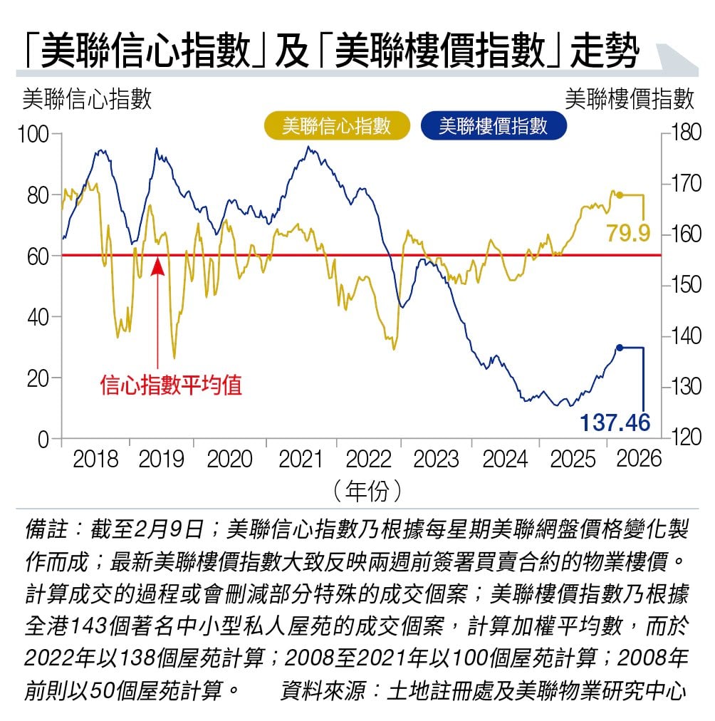 「美聯樓價指數」報137.46點(見圖表),按週升0.32%,連升11週;2026年迄今樓價升2.04%,較去年低位已累升近8.9%,彈勢急勁且具備續航力。