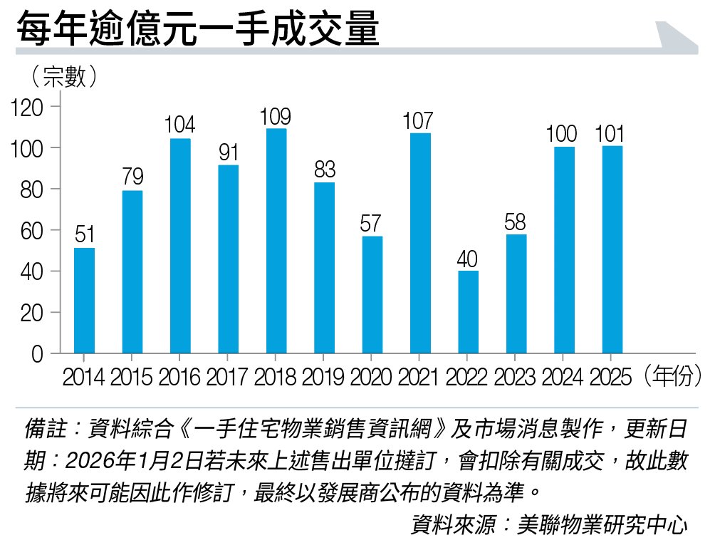 據美聯物業研究中心綜合《一手住宅物業銷售資訊網》資料及市場消息,自2024年逾億元超級豪宅一手成交突破百宗後,2025年續錄得101宗,實現自2013年一手銷售條例實施以來,首次連續兩年「破百」,反映高端買家正以「真金白銀」積極入市,超豪宅板塊正是重點之一(見圖表)。