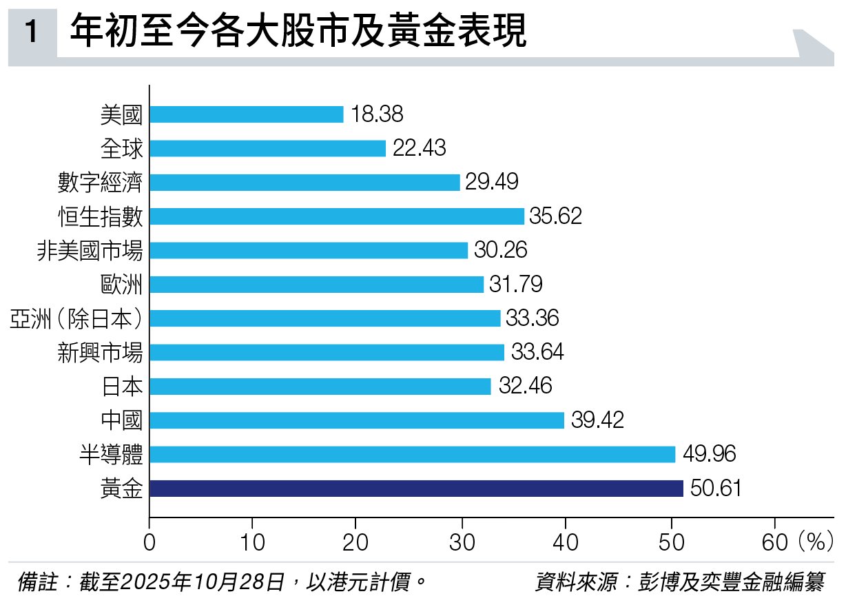 在2019年10月至2025年10月期間,可見黃金與美股及美國國債的相關性,分別為0.09及0.38,雖較於1971年1月至2025年10月的長期平均水平較高,但整體仍維持在較低水平,故黃金在投資組合中仍具一定的分散風險作用,但須留意其效果或將取決隨時宏觀經濟狀況及流動性去向。