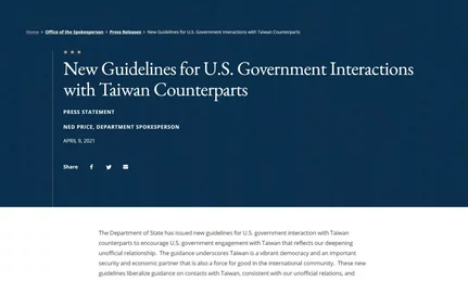 美國國務院發布新指引,表示放寬美國政府與台灣接觸的限制,強調是符合美台非官方關係。新指引指,台灣是充滿活力的民主體制,是國際社會的一股良好力量,又說指引會為華府行政部門提供明確準則,有效根據《台灣關係法》下執行「一中政策」,反映與台灣深化雙邊的非官方關係。據了解,新指引容許美國官員可在聯邦機構內接待台灣官員,亦可出席在前台灣大使官邸舉行的活動,但不能參與台灣雙十節活動。
