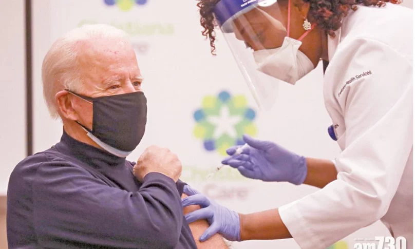 美國上周開始為民眾接種由輝瑞和德國公司BioNTech研發的疫苗,拜登周一在家鄉特拉華州紐瓦克一間醫院注射該疫苗,他說期望打第二劑,並冀以身作則,呼籲大眾毋須擔心副作用,並謹記戴口罩及保持社交距離、聖誕新年假期停止不必要旅行。拜登夫人吉爾亦於同日接種,副總統當選人賀錦麗及丈夫任德龍則將於下周注射。莫德納研發的疫苗周一起也在美國開始接種,首批人士包括連續在前線抗疫277日的德州醫生Joseph Varon,他說︰「真的非常艱難,連續工作277日沒停過,非常疲累……但我開始看到隧道盡頭的光,雖然那是一條非常長的隧道」,他見到疫苗後非常感觸,「我沒有哭,但也差不多了……你知道它可以拯救多少人命嗎?」