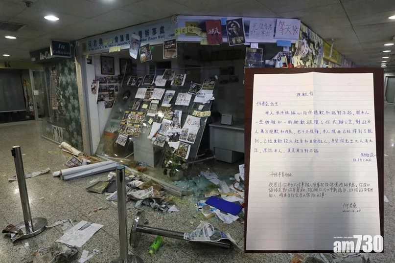 被告朱姓,現年20歲,報稱學生。控罪指他前年7月22日,在無合法辯解下損壞何君堯在荃灣荃豐中心2樓的議員辦事處。被告近日向何君堯致函道歉,稱自己當日破壞辦公室的舉動是「幼稚和一時衝動」,希望得到何君堯原諒。何君堯在fb貼出有關道歉信,指接受被告的道歉並原諒他。