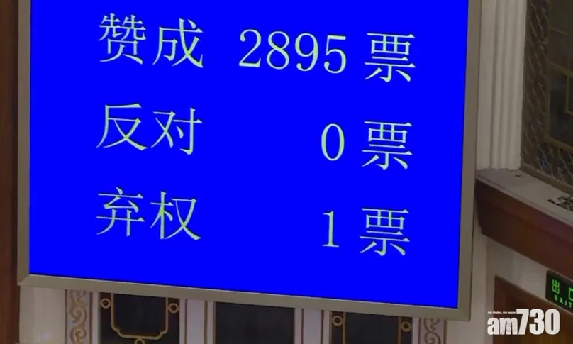 為期7日的全國人大會議下午3時在北京人民大會堂閉幕,表決包括「十四五」規劃、2035年遠景目標綱要,以及有關完善香港特區選舉制度的決定等10項草案。有關完善香港選舉制度決定草案最終以2,895票贊成,0票反對,1票棄權通過,其後草案會修改《基本法》附件一及附件二有關特首及立法會選舉的產生辦法,再交由香港特區政府立法。