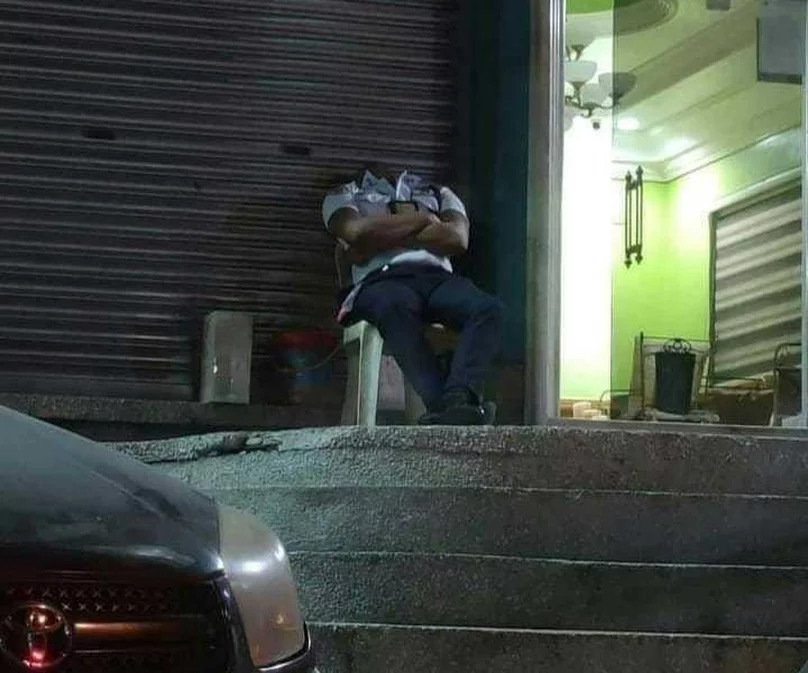 保安工時長,難免因疲累小睡片刻,不過似乎有保安大部分身驅保持「專注」,僅頸以上鬆懈,大角度後抑,剛好有網友拍攝的角度看不到他的頭部,儼如「無頭保安」,發文指「保安哥哥唔好嚇人啦」。
