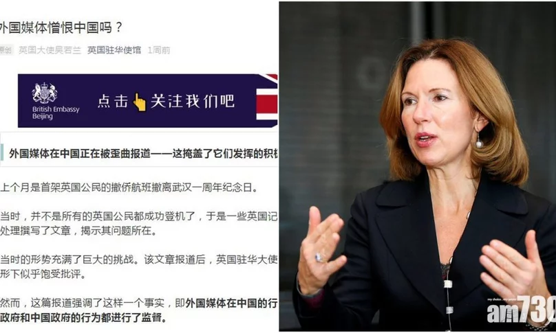 外交部歐洲司負責人召見英國駐華大使吳若蘭,就她在內地社交媒體發表的一篇署名文章,提出嚴正交涉。批評文章充斥著「教師爺」式的傲慢及意識形態偏見,顛倒黑白、操弄雙重標準,有關做法同外交人員身份及外交機構職能嚴重不符。