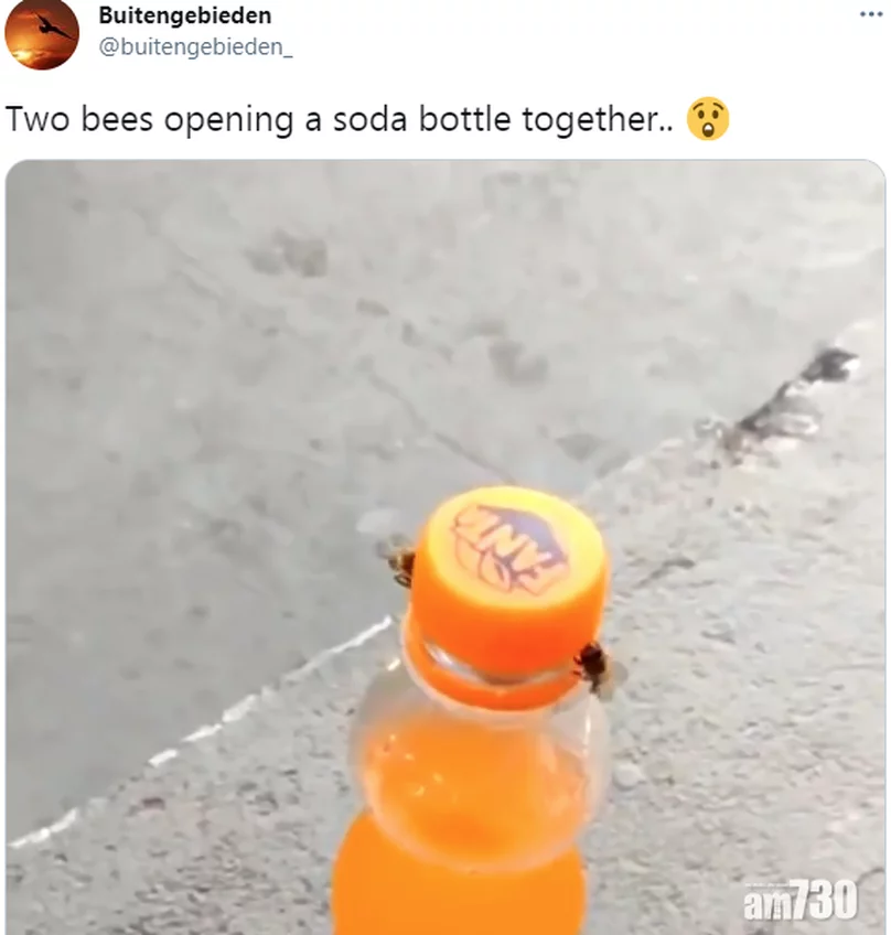 彰顯團隊精神|兩隻蜜蜂合力推開汽水樽蓋 (有片) 經濟一週 社會熱話 May 26 2021 分享至 網民熱話 廣告 閱讀全文 Twitter瘋傳一段短片,兩隻小蜜蜂被一樽橙色的芬達汽水甜味吸引,只見牠們分別在兩邊很忙碌地在已扭鬆的樽蓋邊「搵位攝」。在一番努力下,牠們細小的頭仔終於攝入樽蓋邊罅位,然後「一、二、三」頭部往上頂,終於成功推開樽蓋,有汽水飲!網友都覺得很神奇,有人形容「難以置信的出色團隊精神」。 頭仔成功攝入樽蓋邊緣罅位。 (互聯網) 頭部往上頂終於推開樽蓋。 (互聯網) 資料來源:AM730 分享至