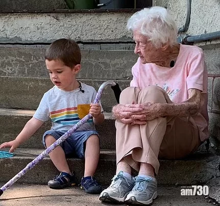 Mary O’Neill的丈夫37年前去世,她今年12月便滿100歲,非常開心2歲的Benjamin Olson能陪伴她。Benjamin母親說,因防疫措施,兒子超過1年無見其他小朋友,除了家人,他接觸的就是Mary,最後成為了好朋友。初時老婆婆只是隔著窗向Benjamin揮手,之後她步出屋外向對方打招呼,最後演變成兩人定時見面。