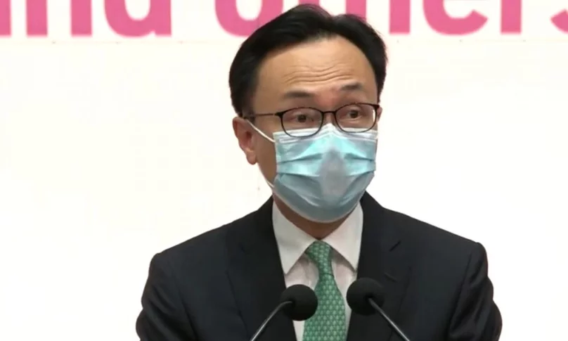 公務員事務局長聶德權及食物及衞生局長陳肇始見傳媒。聶德權宣布,新冠疫苗接種計劃優先群組擴大範圍至30至59歲,同時增加兩個組別,分別是在香港以外讀書的16歲或以上人士,以及外藉家庭傭工。