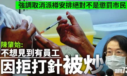 政府計劃食肆員工及客人,接種新冠疫苗後可以放寬防疫措施。食物及衛生局長陳肇始在電台表示,稍後政府部門將與業界商討當中執行細節,包括因為各種原因而不適宜接種疫苗的人士,在進入有關處所時應如何出示相關證明等。她說不想見到員工和老闆站在對立面,亦絕對不希望見到有處所的僱主,因為員工不打疫苗而解僱他們。