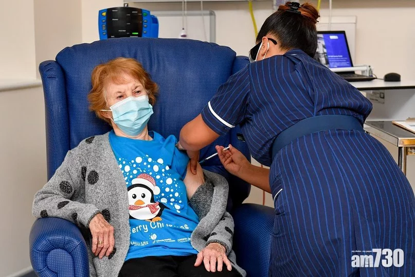 英國今天起為民眾接種輝瑞藥廠的新冠肺炎疫苗,是全球首個國家在臨床測試以外的大規模接種,期望可遏制疫情持續下去。接受今次「全球第一針」的是下周迎接91歲生日的英婦Margaret Keenan,她形容這一針是最佳預祝生日的禮物。