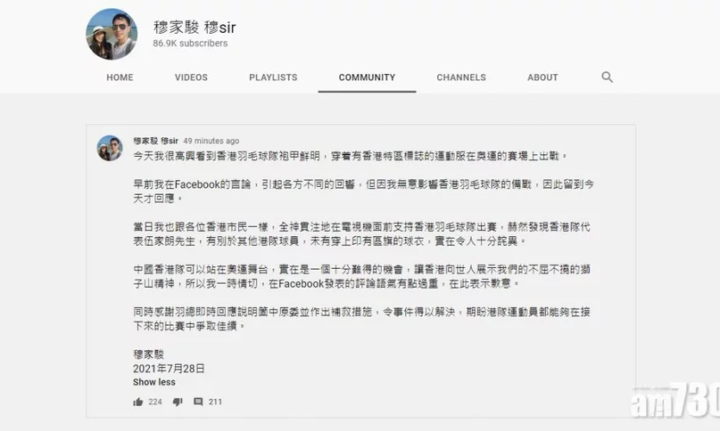 日前在fb發文「強烈譴責」出戰東京奧運的港隊羽毛球「一哥」伍家朗球衣無區徽的民建聯穆家駿在YouTube發文,首次就球衣事件表示歉意,指自己「一時情切」,在fb發表的評論語氣有點過重。