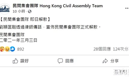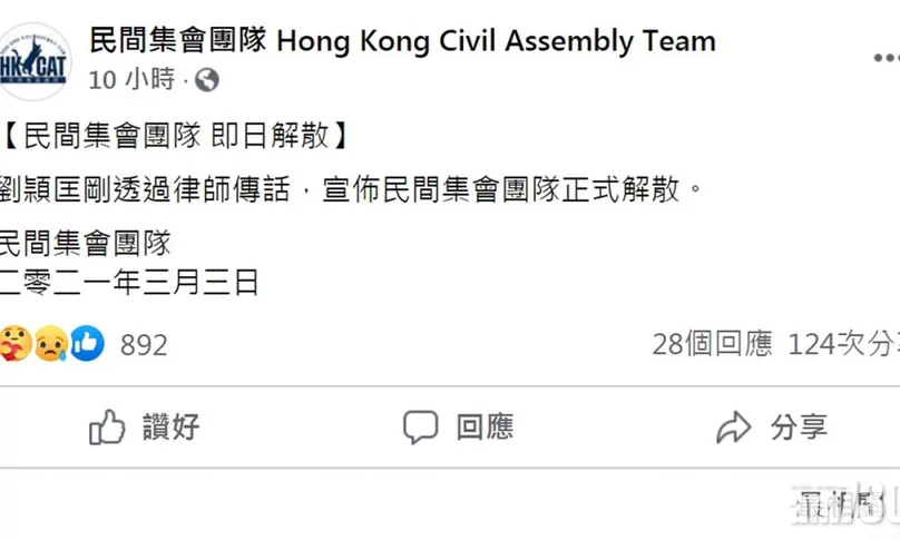 民間集會團隊宣布解散 經濟一週 社會熱話 Mar 4 2021 分享至 網民熱話 廣告 民間集會團隊在社交專頁宣布解散。 閱讀全文 涉去年民主派初選案件、被控「串謀顛覆國家政權罪」的民間集會團隊發言人劉頴匡,透過律師傳話,宣布民間集會團隊正式解散。 47名組織及參與去年民主派初選的人士,被控「串謀顛覆國家政權罪」。 資料來源:AM730 分享至