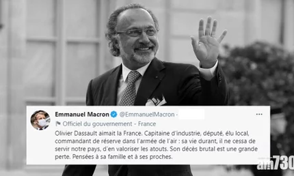 法國總統馬克龍在社交網站向奧利維耶達索致敬,指他熱愛法國,是行業領袖、議員、空軍預備役司令,一生從未停止為國家服務,他突然離世是巨大損失。