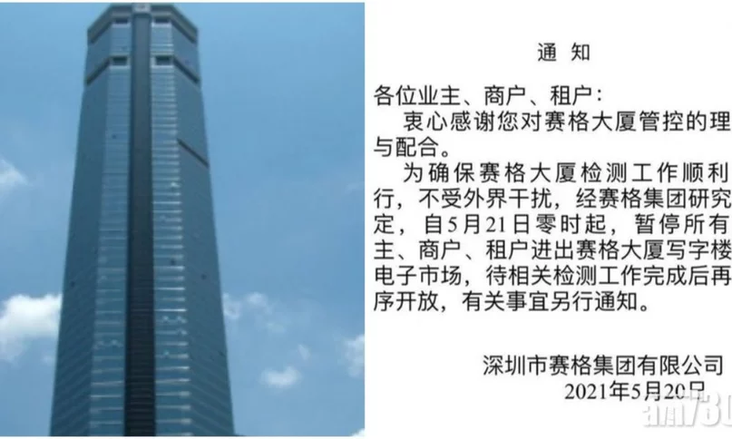 賽格集團發出通知,表示為了確保大廈檢測工作順利進行,不受外界干擾,要求業主、商戶和租戶凌晨零時起, 暫停出入寫字樓和電子市場,要在搖晃原因調查後,才再有序開放。