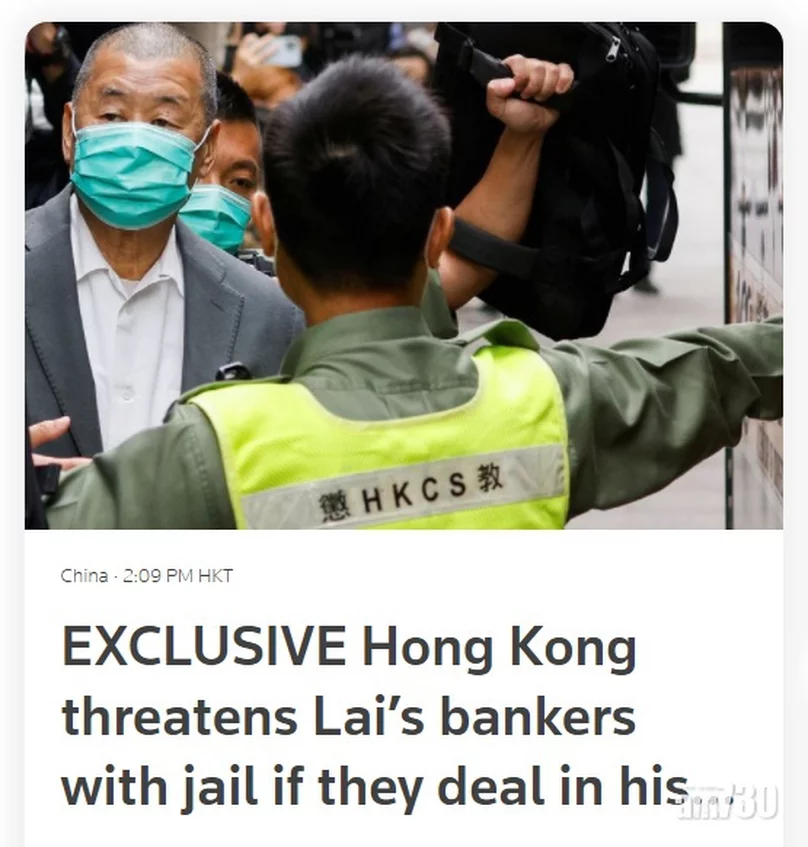 報道引述資深銀行家表示,政府凍結黎智英資產的決定,意味國家安全機制已延伸本港銀行系統內的精英階層,財務管理人和銀行客戶所面對風險亦因事件曝露出來。花旗銀行發言人表示,必須遵守市場所有適用的法律和法規。滙豐銀行拒絕評論。