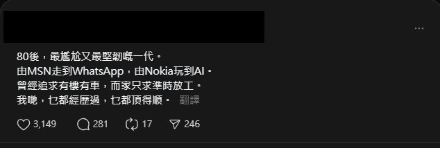 「我哋唔係由MSN開始,而係由冇電腦、冇冷氣、撥號電話開始,一路追趕到iPhone 17 Pro Max。」這句留言,道出了80後的真實寫照——他們不只是科技變革的使用者,更是時代轉型的見證者與承受者。