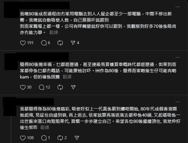 「80後幾精彩,唔使好似上一代咁艱苦,又唔似下一代咁脆弱。我哋見證由盛到衰,再由衰返盛,依家40頭,仲有力再搏多次。」這類留言在網上屢見不鮮。