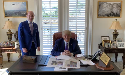 美國前總統特朗普在佛州海湖莊園(Mar-a-Lago)的最新辦公室曝光,從高級顧問米勒(Stephen Miller)周一上載Twitter的照片可見,特朗普坐在辦公桌前,笑容燦爛,米勒站在他旁邊。特朗普所用的辦公桌,形似他任總統時白宮橢圓形辦公室的堅毅桌(Resolute Desk),上面放著一副眼鏡、一份打開的《華爾街日報》和建造美墨邊境圍牆的紀念座等。