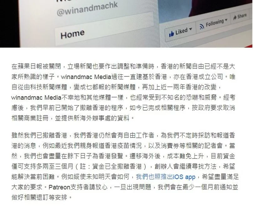 稱受不知名恐嚇和威脅 網媒winandmac宣布撤離香港